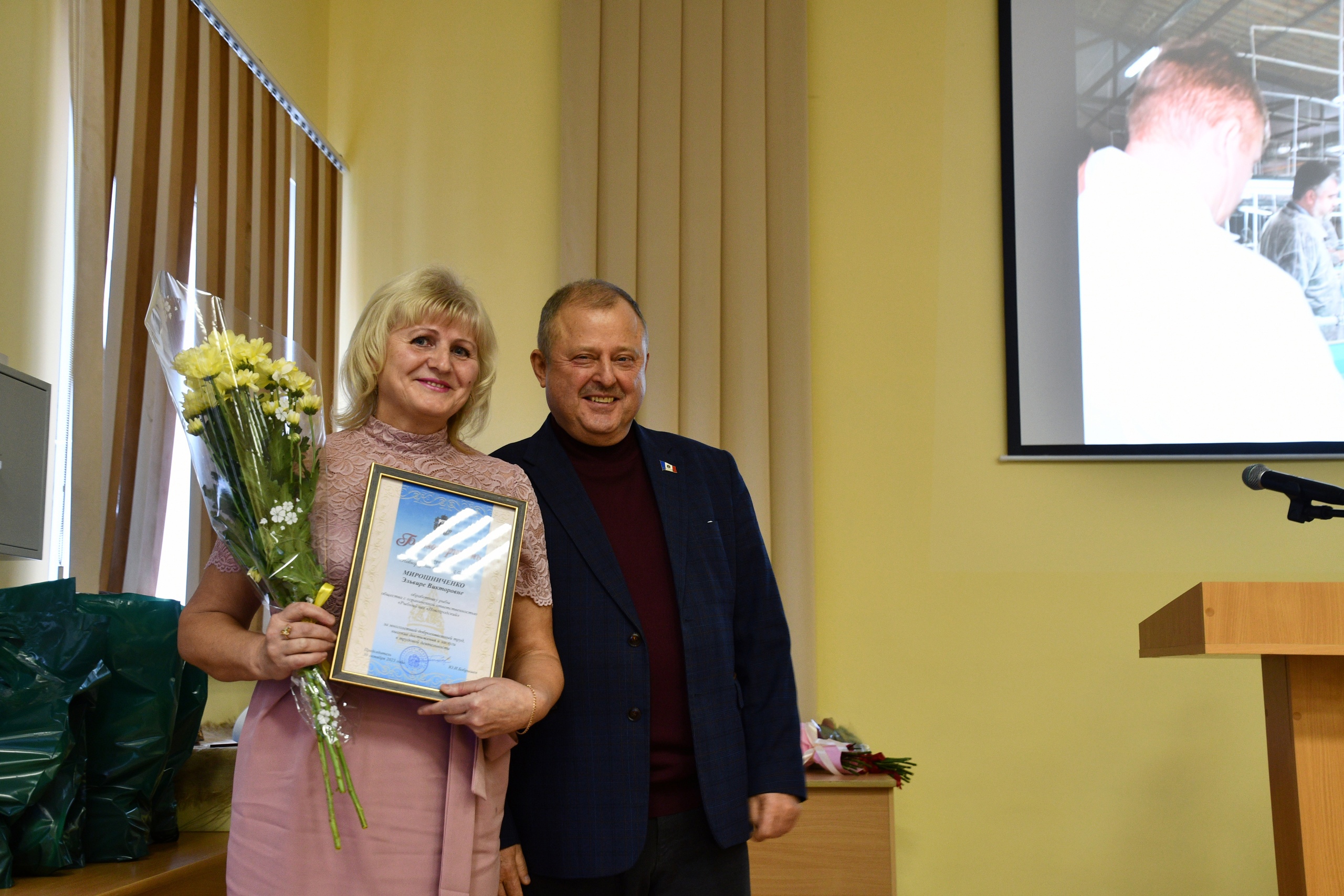 Владимир Королёв вручил Благодарность председателя Новгородской областной Думы представителю рыбоперерабатывающей отрасли Эльвире Мирошниченко.